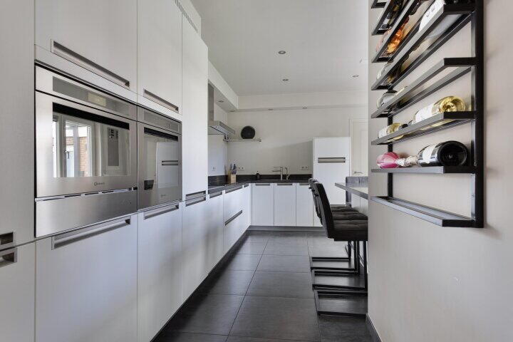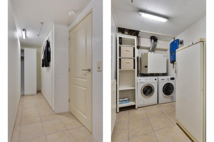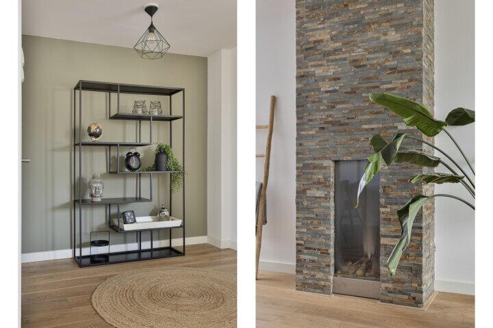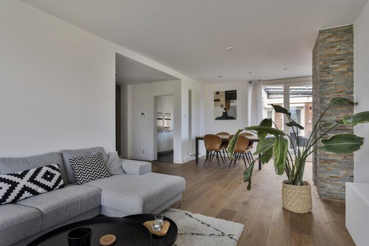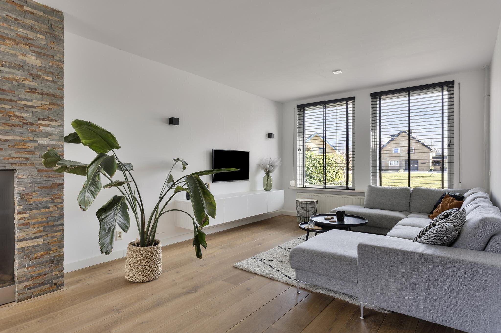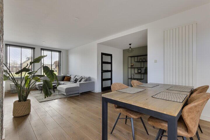 De ruime, lichte woonkamer is een heerlijke plek om te ontspannen. De houten vloer, strak gestucte wanden, een gashaard én een schuifpui naar de tuin zorgen voor een warme en luxe sfeer. De woonkamer staat in open verbinding met de moderne keuken, die werkelijk van alle gemakken is voorzien. Denk aan een inductiekookplaat, Quooker, oven, magnetron, koelkast, vaatwasser, bordenwarmer en zelfs een bar met tv – ideaal voor gezellige avonden! Vanuit de keuken loop je naar de gang met een praktische inbouwkast, een deur naar de tuin en toegang tot de masterbedroom, de badkamer en de berging met wasmachine- en drogeraansluiting.